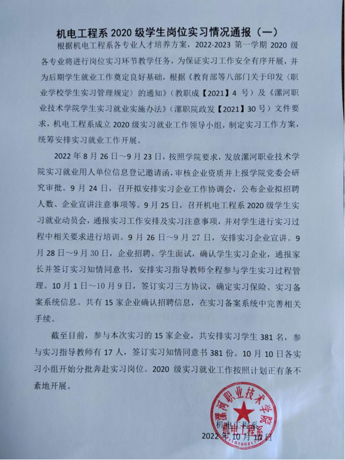 WilliamHill中文官网2020级员工岗位实习情况通报(一)