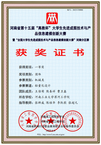 今年河南省省赛参赛人数多达1600余人,59支队伍,其中机械类1001人,参赛人数创历史新高。WilliamHill中文官网通过校赛多次选拔、集中培训,最终选定王静涛、陈奎佑等11名同学代表公司参赛。在团队老师的悉心指导和同学们的不懈努力下,最终获得成图赛道一等奖3项、二等奖2项、三等奖2项、轻量化设计赛道一等奖的优异成绩。