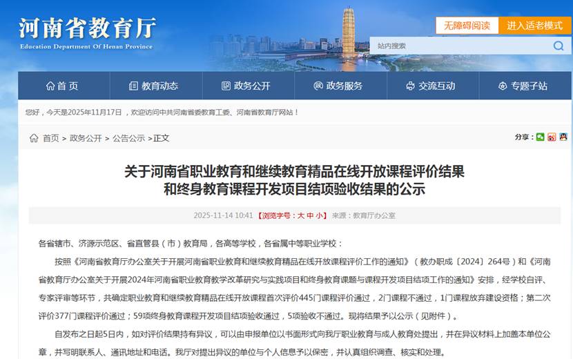 近日,河南省教育厅公布2024年职业教育和继续教育精品在线开放课程评价结果,WilliamHill中文官网《纯电动汽车整车故障诊断与维修》《单片机技术及应用》《机械绘图与识图(一)》三门精品在线开放课程通过首次评价,《自动化生产线安装与调试》精品在线开放课程通过第二次评价,彰显了公司在课程建设与教学改革领域的硬核实力。