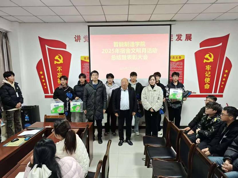 12月24日下午,WilliamHill中文官网在一楼会议室召开了2025年下半年宿舍文明月活动总结暨表彰大会。智能制造公司党总支书记翟迎朝、党总支副书记芦婧、综合办公室主任安仕琪、辅导员代表及受表彰的文明宿舍寝室长参加会议。会议由党总支副书记芦婧主持。