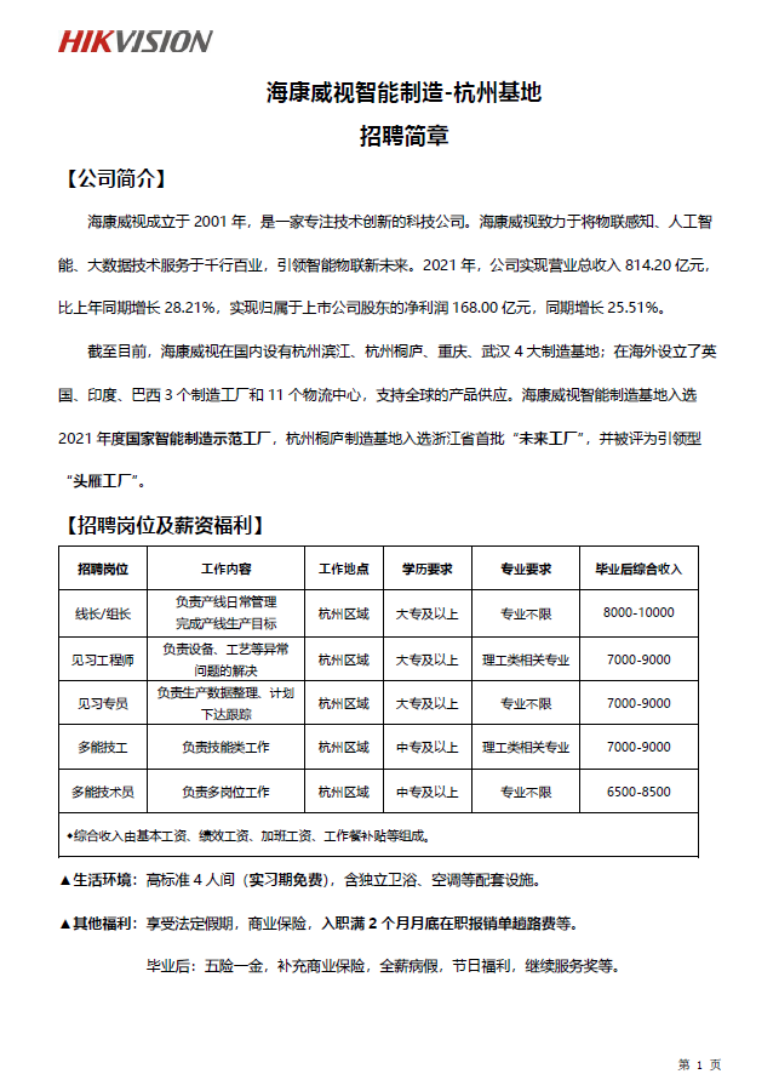 海康威视智能制造-杭州基地招聘简章